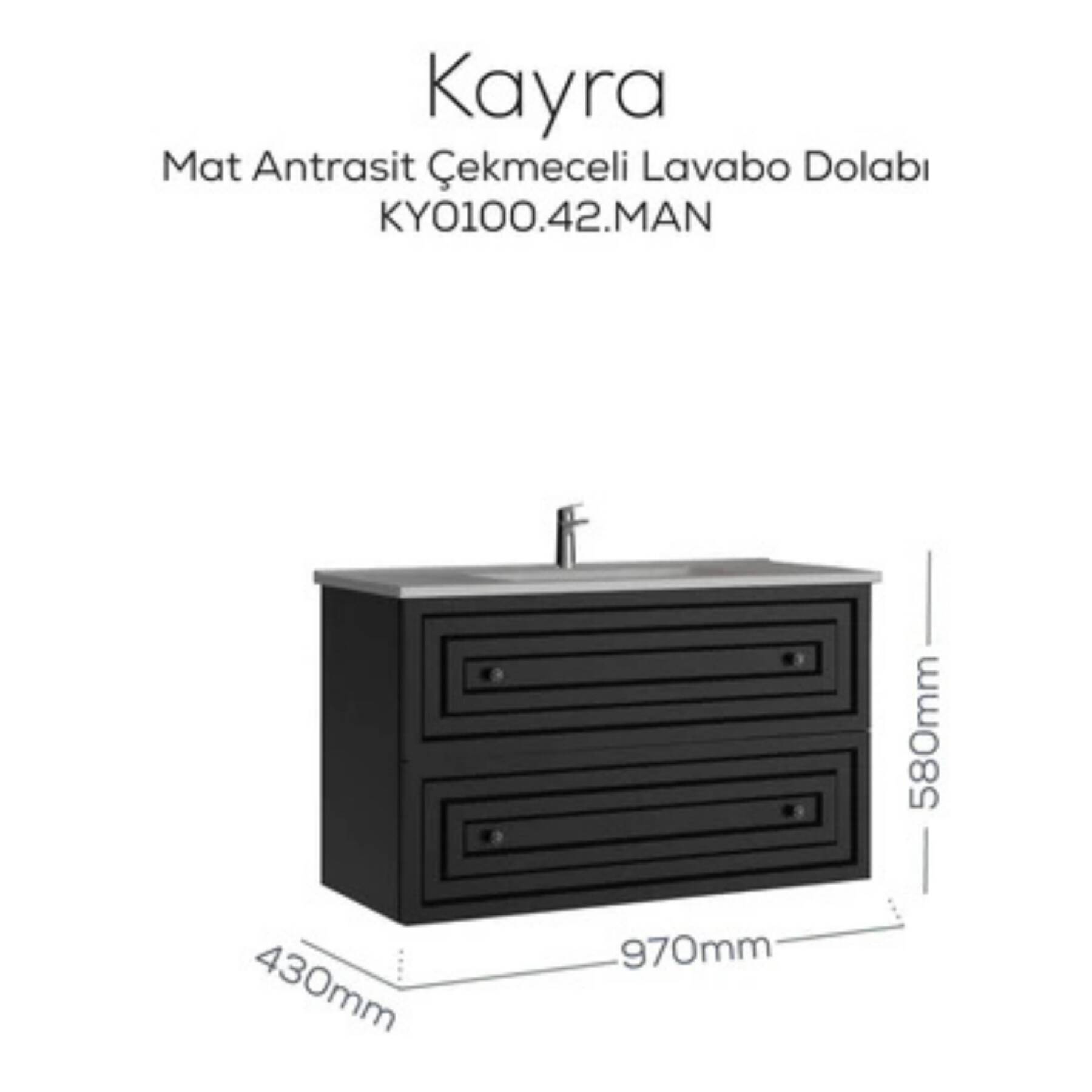 Modern çizgileri ve sofistike rengiyle öne çıkan Mat Antrasit renkli Creavit Kayra Çekmeceli Lavabo Dolabı, banyonuza hem estetik hem de işlevsel bir dokunuş katıyor. 970 x 580 x 435 mm ölçülerindeki bu şık çekmeceli dolap, geniş iç hacmiyle günlük kullanım ürünlerinizi kolayca depolamanızı sağlarken, mat antrasit rengiyle güçlü ve çağdaş bir görünüm sunuyor.